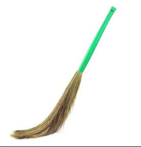 This traditional hand broom is a lightweight and durable cleaning tool, designed for effective sweeping of dust and dirt. The bristles are made from natural grass fibers, which are tightly bound to provide strong and flexible sweeping action. The long green plastic handle ensures a comfortable grip, making it easy to clean floors, corners, and hard-to-reach areas without bending too much.