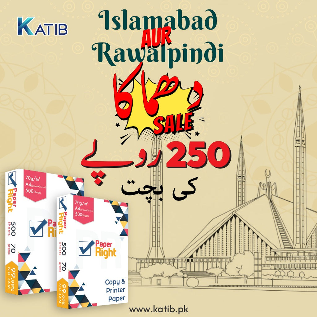 Looking for A4 size Printer paper? Buy A4 size Paper Right Printer paper with a weight of 70 Gsm (grams per square meter) is a type of paper that is commonly used for printing documents and images. The paper is typically A4 size paper, which is 210mm x 297mm, and is the standard size for many office printers and copiers. The weight of the a4 size paper, 70 Gsm, refers to the thickness and sturdiness of the paper. A higher Gsm number generally indicates a thicker, more durable paper. This type of paper is suitable for printing text and graphics and is often used for things like letters, reports, and presentations. You can buy a4 size paper right printer paper in Karachi, Lahore, Islamabad and across Pakistan at discounted price.