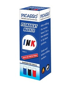 Picasso PC-PMI Permanent Marker Ink Bottle having 15ml. ink is in leak-proof plastic bottle. Unbreakable plastic bottle with convenient refilling. Excellent in smudge-proof and waterproof feature. Permanent on plastic, Glass, Metal, Fiber, Film, Paper, Board and Textile. OHP, CD/DVD and most other surfaces after 3 seconds. Quality Permanent Marker inks, suitable for refilling all types / brands of Permanent Markers.