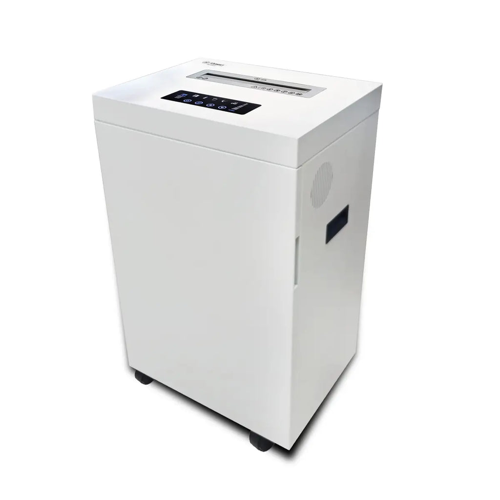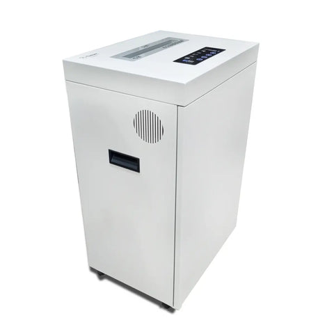 This shredder can shred Papers or Credit/ATM Card & CD/DVD/Paper Clips/Staples/Paper Clips with Cross Cutting. Featuring a Shredding Capacity of 25 Papers and single credit/ATM Card or CD/DVD. Shred Size of 4×40 mm particles. Basket capacity of 45 Litres/11.88 Gallons with Pull Out having Bin Full Sensor & Switch.